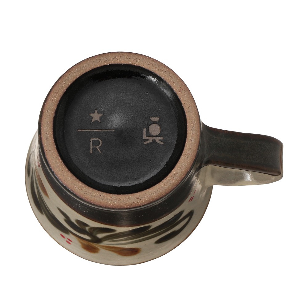スターバックス リザーブ® ロースタリー 東京と沖縄・読谷の“縁”が土の上に育っていく様を、“つながり”や“繁栄”の想いを込めた伝統的な唐草文様とコーヒーチェリーを想起させる赤ドットの絵付けを組み合わせて上段にデザイン。陶器にもコーヒー栽培にとっても大切な要素である大地・土を、下段のブラウンの釉薬で表現しました。