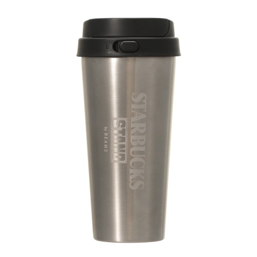 STARBUCKS STAND by BEAMSのオリジナルのステンレスボトルです。スターバックス定番のペーパーカップをモチーフにした形状に、“STARBUCKS STAND by BEAMS”のロゴを施しました。背面にはサイレンロゴの型押し、BEAMSとSTARBUCKSのロゴがレーザーで刻印されています。ドリンクを注ぎやすい広い口径は、洗いやすく、氷を入れる際にも便利。リッドにはロック機能があり、ボタンを右にスライドさせ、押し込むことでフタが開く仕様です。真空二重構造ステンレスで保温・保冷性に優れています。(漏れ防止:あり)