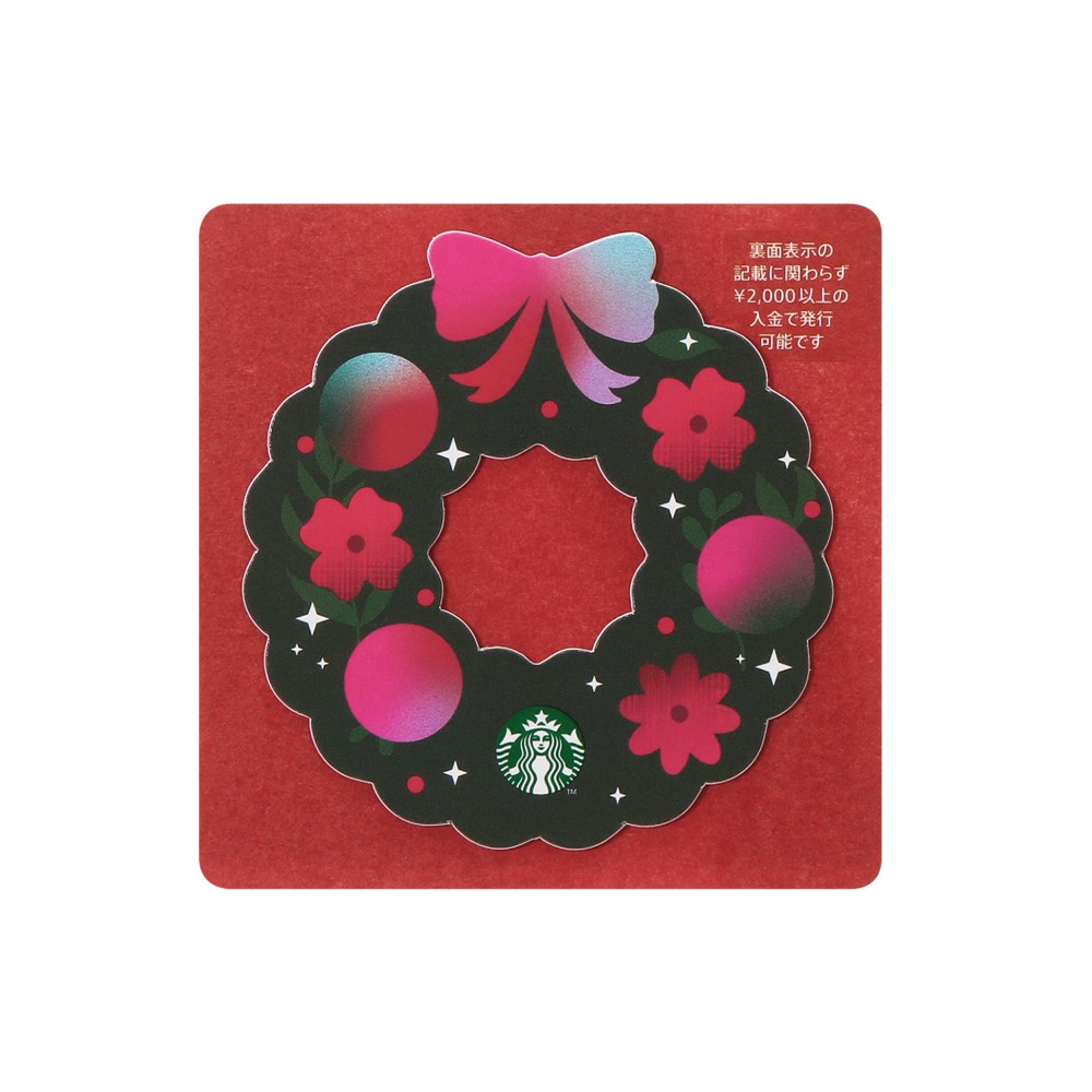 赤い飾りが印象的なリース型のスターバックス カードです。持っているだけで気持ちが浮き立つような、このシーズンならではの華やかなデザイン。ご自身でご愛用いただくのはもちろん、親しい方へのギフトにいかがでしょうか。