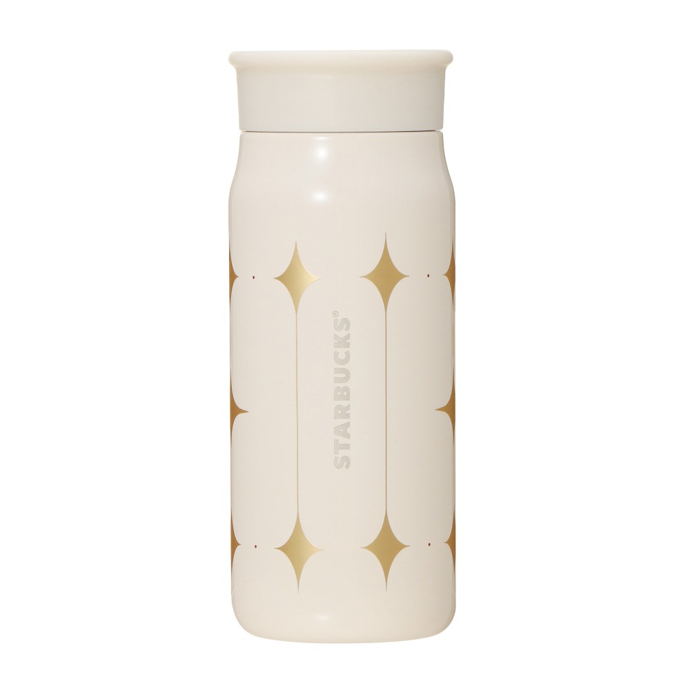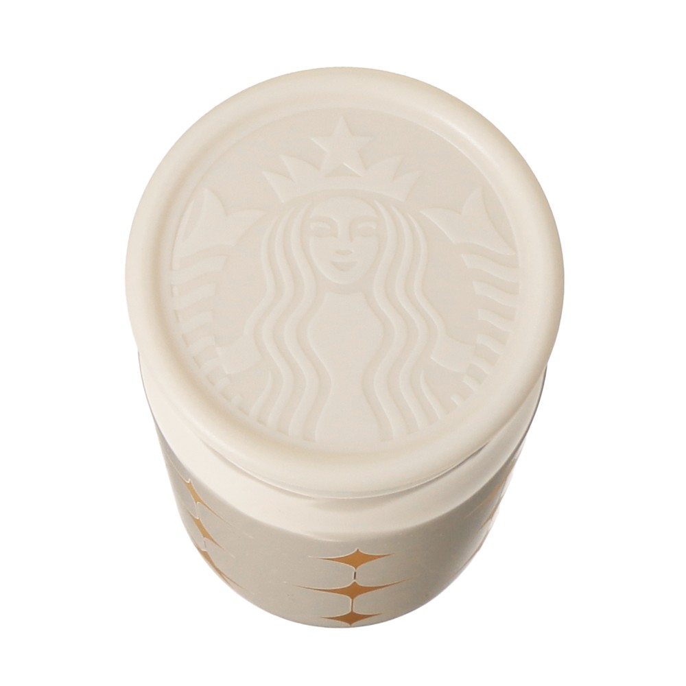 手のひらサイズのコンパクトな見た目ながら355ml入るステンレスボトルです。やわらかなアイボリーのボディにゴールドと赤色のアクセントがスタイリッシュです。背面にはスターバックスロゴをレーザー加工で表現しました。真空二重構造ステンレスで保温・保冷性に優れています。(漏れ防止:あり)