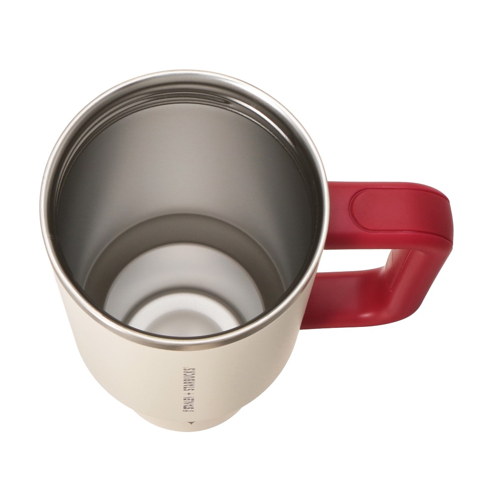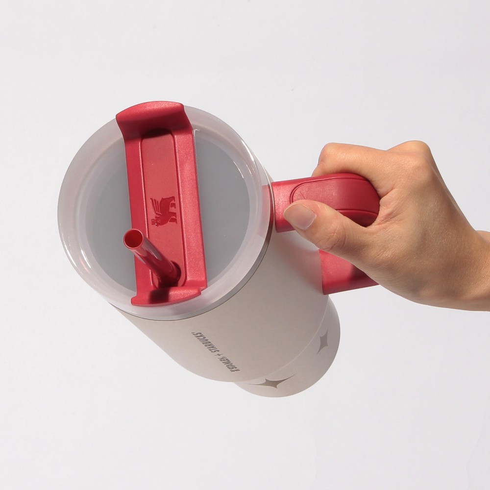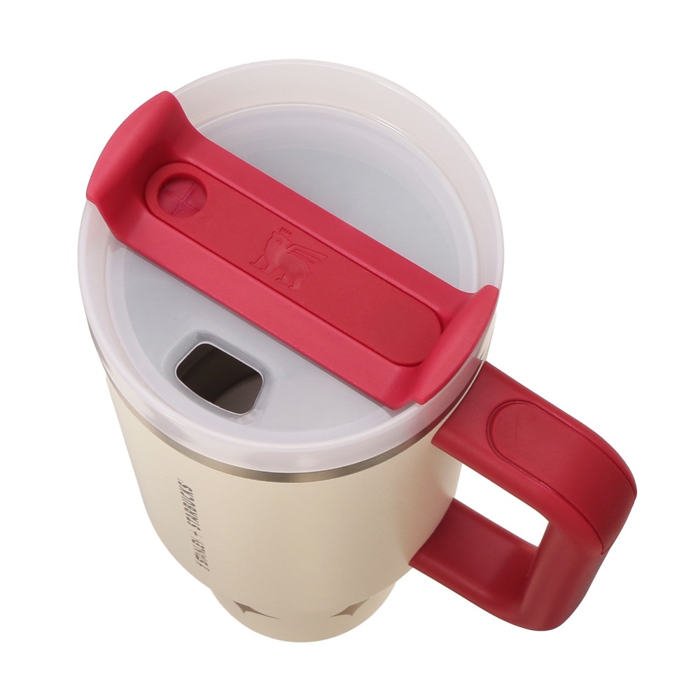 リッドのカバーパーツを回転させることで「直接飲む」「ストローをさして飲む」「飲み口を閉じる」3通りの使い方ができ、様々なシーンに合わせて使える万能なタンブラーです。ストローベースにシリコンカバーが付き、ストローは滑りにくくなっています。やわらかなアイボリーに、ハンドルやストロー部分の赤色がアクセントになり、ダイヤマークもきらりと映えるデザインです。