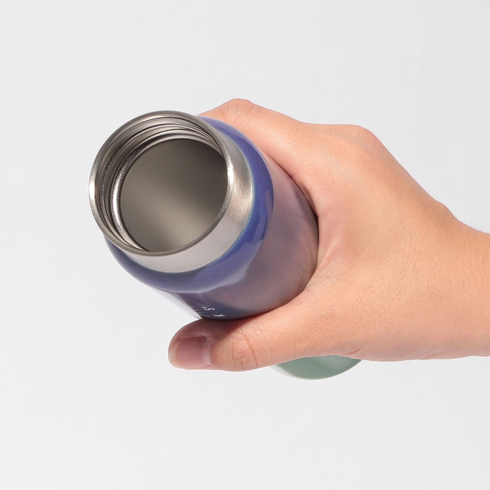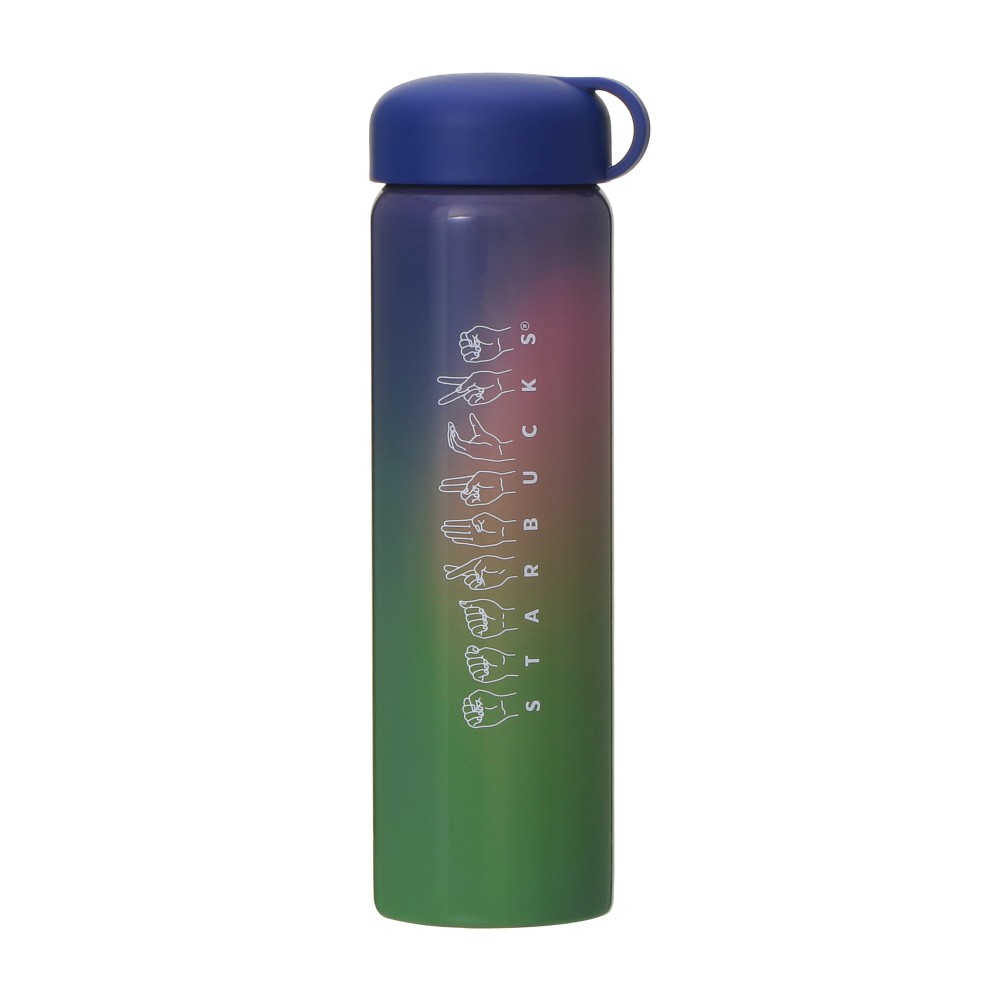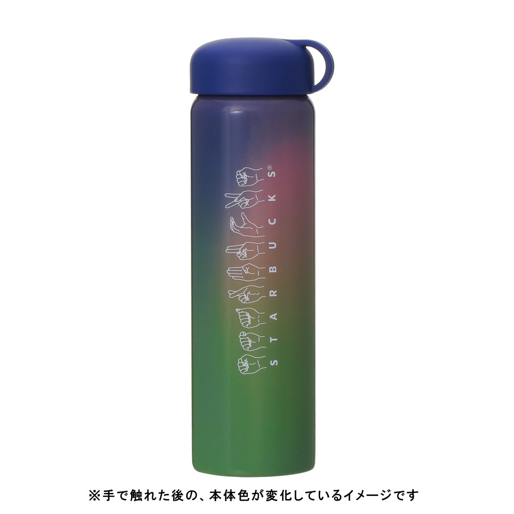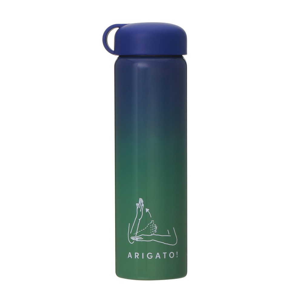 サイニングストアのパートナーの皆さんと一緒に開発したステンレスボトルです。手で触れた部分の色が変わる感温塗装が施されたボディーに「ARIGATO」の手話が描かれています。真空二重構造ステンレスで保温・保冷性に優れています。(漏れ防止:あり)