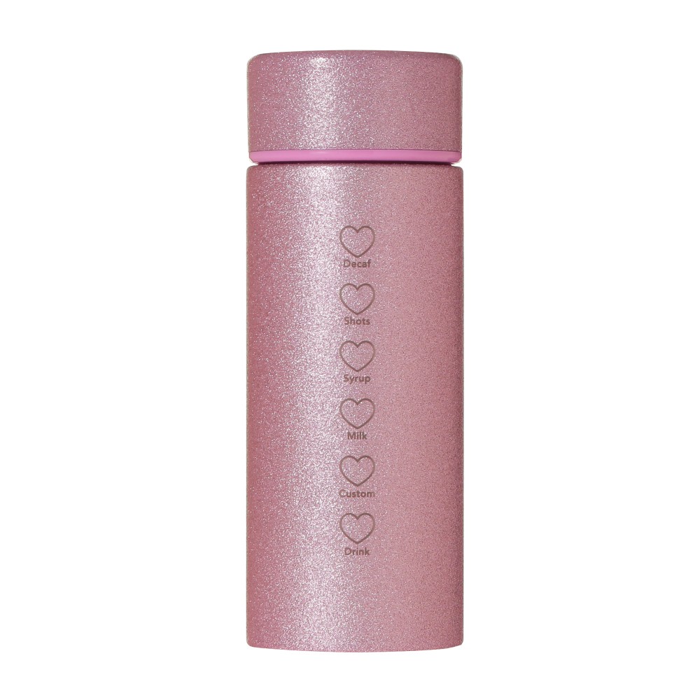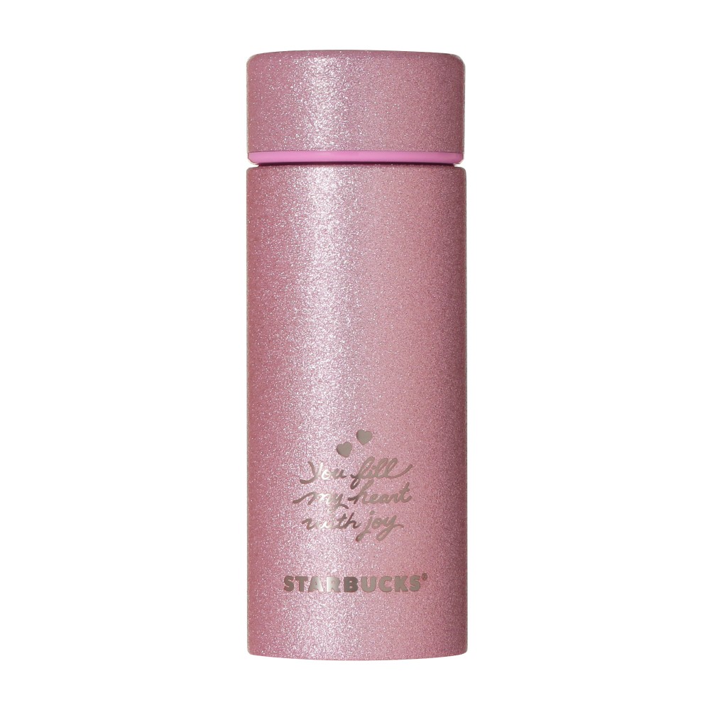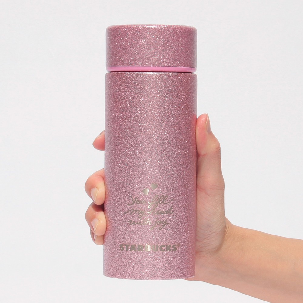 リッドを含む全面がピンクのグリッターできらめくステンレスボトルです。STARBUCKSのワードロゴと、ハートとメッセージがレーザー加工で表現されています。オンラインストアでは、色違いのレッドもございます。真空二重構造ステンレスで保温・保冷性に優れています。(漏れ防止:あり)