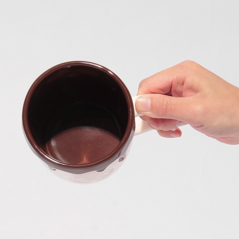 お店で使用しているマグカップの飲み口に、溶けたチョコレートがかかったようなユニークなデザインです。本体はマット加工で落ち着いた色味になっていますが、チョコ部分は光沢のある素材を使っていて、素材の違いも楽しめます。