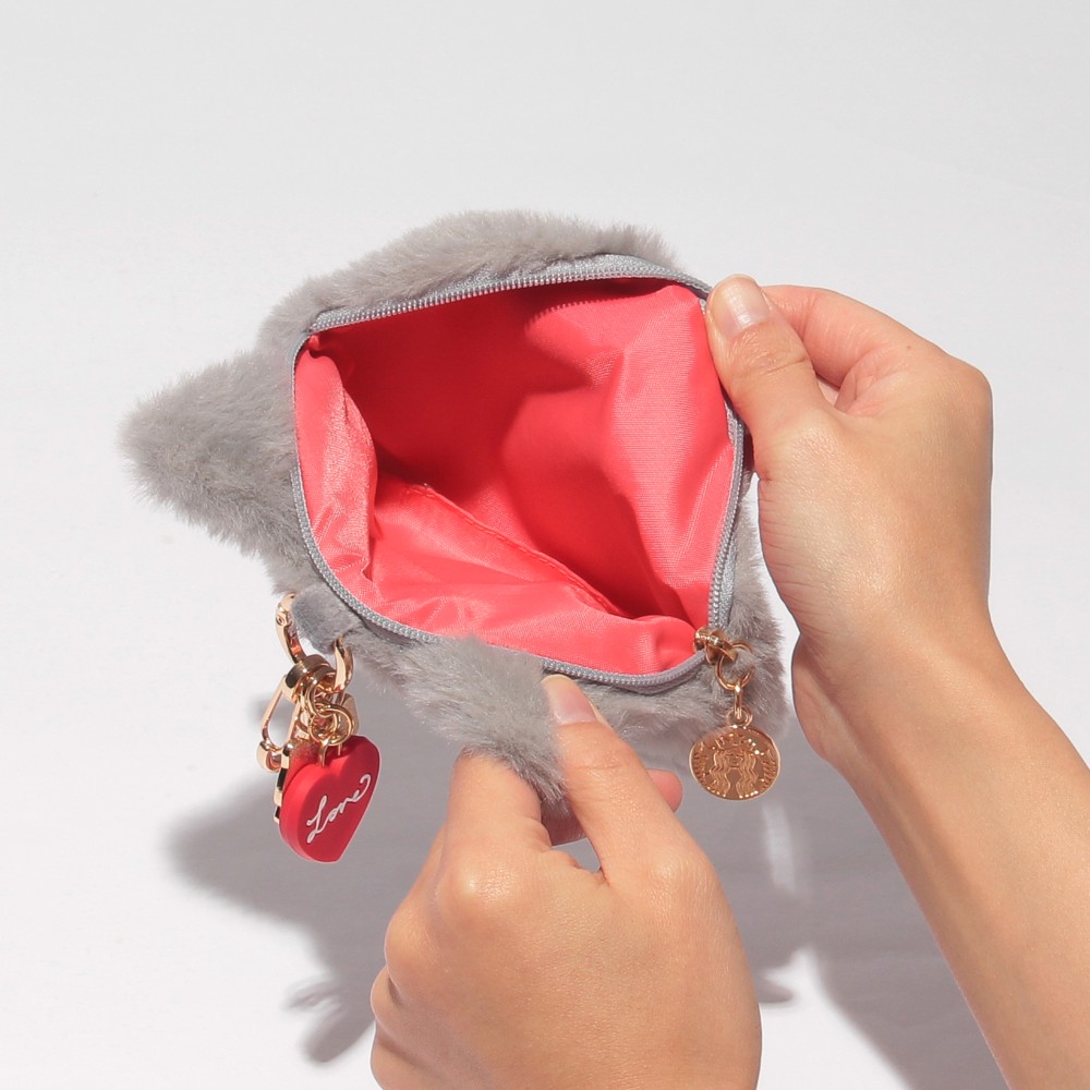 思わず触りたくなるような温かみのあるエコファー素材を用いたポーチです。猫の顔がそのままデザインされ、チャームのようにバッグなどにも取り付けることも可能です。金具部分には、リボンとハートのモチーフ、ファスナー引手にはサイレンロゴをデザインしました。持っているだけで心が癒されそうなデザインです。