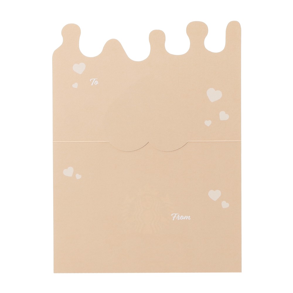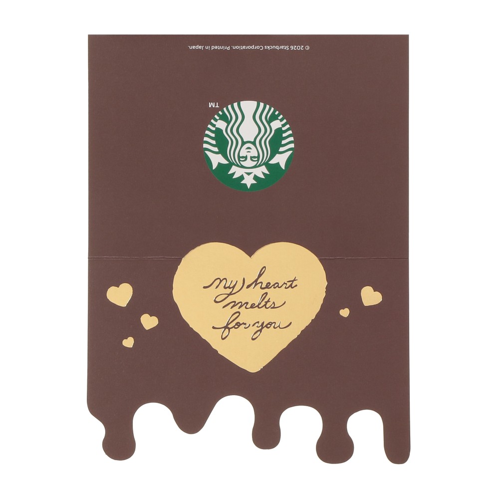 メッセージに「フード」と「ドリンク」のセットを添えて贈るというコンセプトのメッセージカードです。大切なあの人へ、フードとドリンクを一緒に楽しめるコーヒータイムを贈りませんか。この季節の人気フード「チョコケーキ」と「カップ」のイラストがスターバックスらしいデザインです。背景は甘いチョコが溶けたデザインとなっており、贈り物に最適な仕立てになっています。