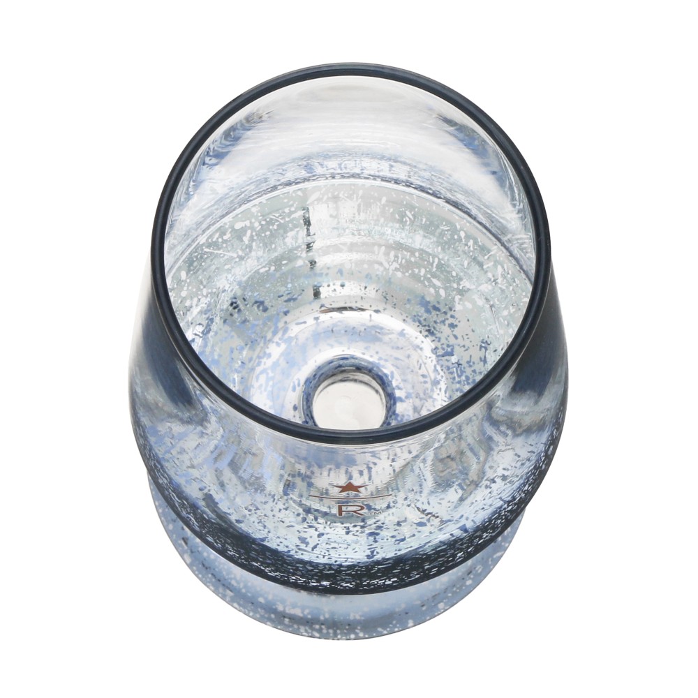 メタリックブルーの脚付きグラス。スターバックス リザーブ® ロースタリー 東京のバーカウンター内にある、コーヒー豆をストックするサイロの形状をイメージしてデザインしました。ホームパーティーはもちろん、毎日のテーブルを華やかに彩ります。