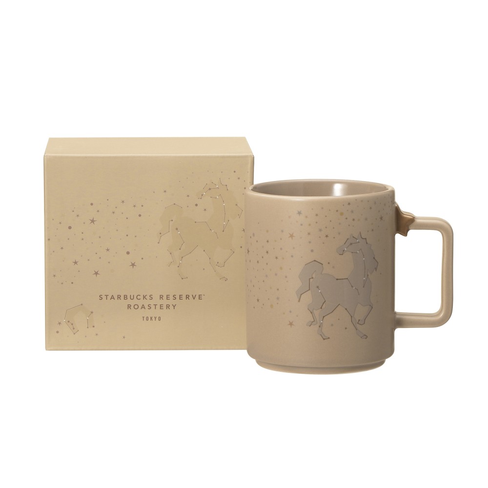 2026年の干支である午(うま)と馬蹄(ばてい)を、スターバックス リザーブのロゴの「★」とともに星座に見立ててデザインしたマグカップ。馬蹄の逆U字型は不運を振り落とす意味があるとも言われており、古くから「幸運のお守り」として親しまれています。ハンドルに配された、ハンドペイントしたカッパー色の★がデザインのアクセント。外側はマットに、内側はツヤのある釉薬を使用し、あえて質感を変えています。