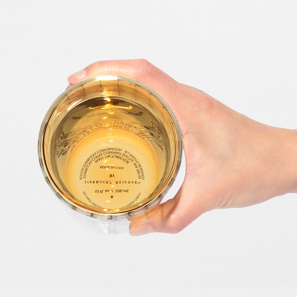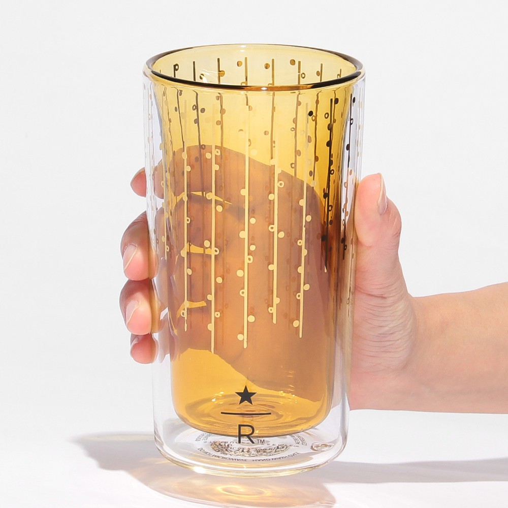 世界のスターバックス リザーブ® ロースタリーのインテリアデザインからインスパイアされた、“Roasted” コレクションのダブルウォールグラス。ロースタリー 東京のキャスクの特徴である垂れ下がる桜の花びらをゴールドで表現しています。内側はアンバー色のカラーグラスを使用。耐熱グラスのダブルウォールなので、ホットにもアイスにもお使いいただけます。