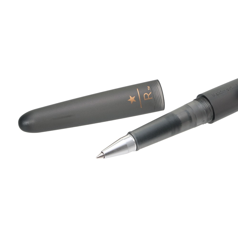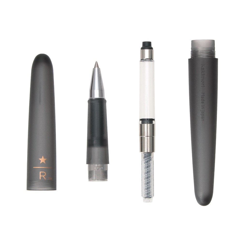 スターバックス リザーブ® ロースタリー 東京が提案する「コーヒーと共に過ごすデスクワークシーン」にちなんだローラーボールペン。万年筆用インクを補充してお使いいただけます。東京蔵前に店舗をかまえる文具店「カキモリ」が製作しました。書きやすさを考えたなめらかなフォルムで、半透明ブラックの軸がデスクになじむデザインです。スターバックス リザーブのロゴが刻印されています。