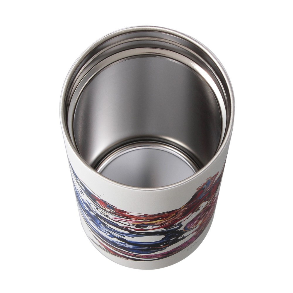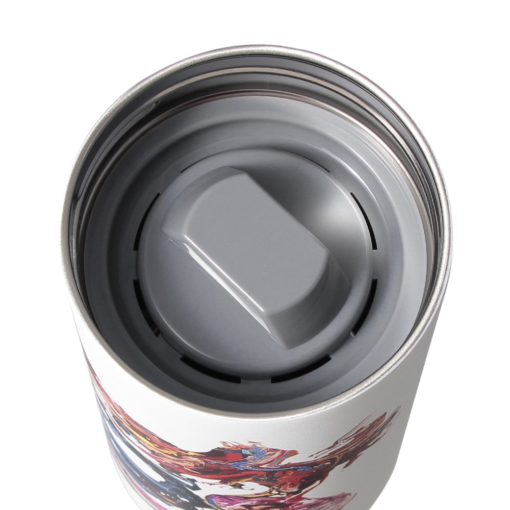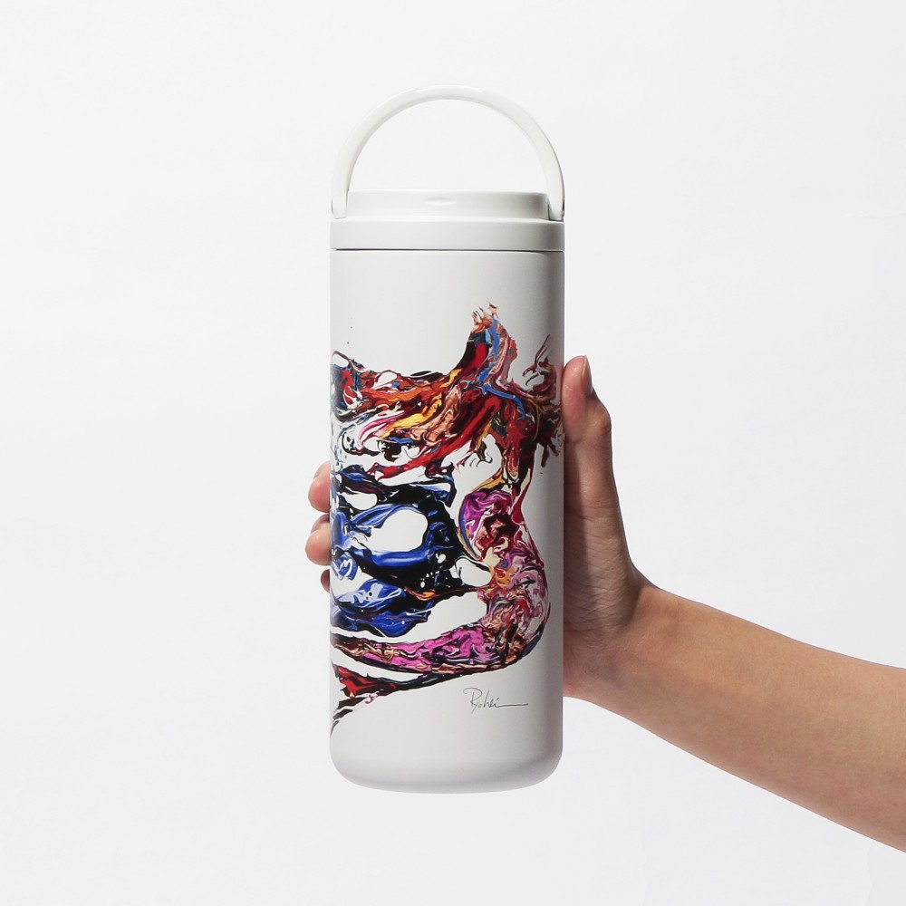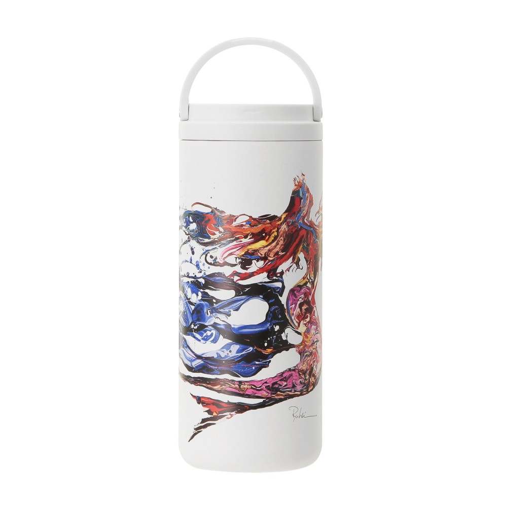 スターバックス リザーブ® ロースタリー 東京の7周年を記念したステンレスボトル。ハンドル付きで持ち運びに便利です。キャンバスのように真っ白なボトルに映える、躍動感あふれるサイレンのアートが印象的です。サイレンの頭上で輝くクラウンをイメージした7周年アイコン付き。真空二重構造ステンレスで保温・保冷性に優れています。(漏れ防止:あり)