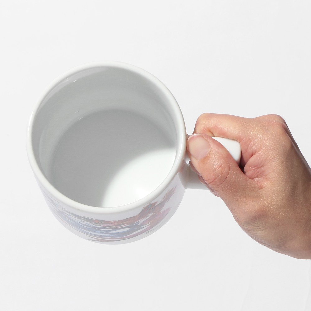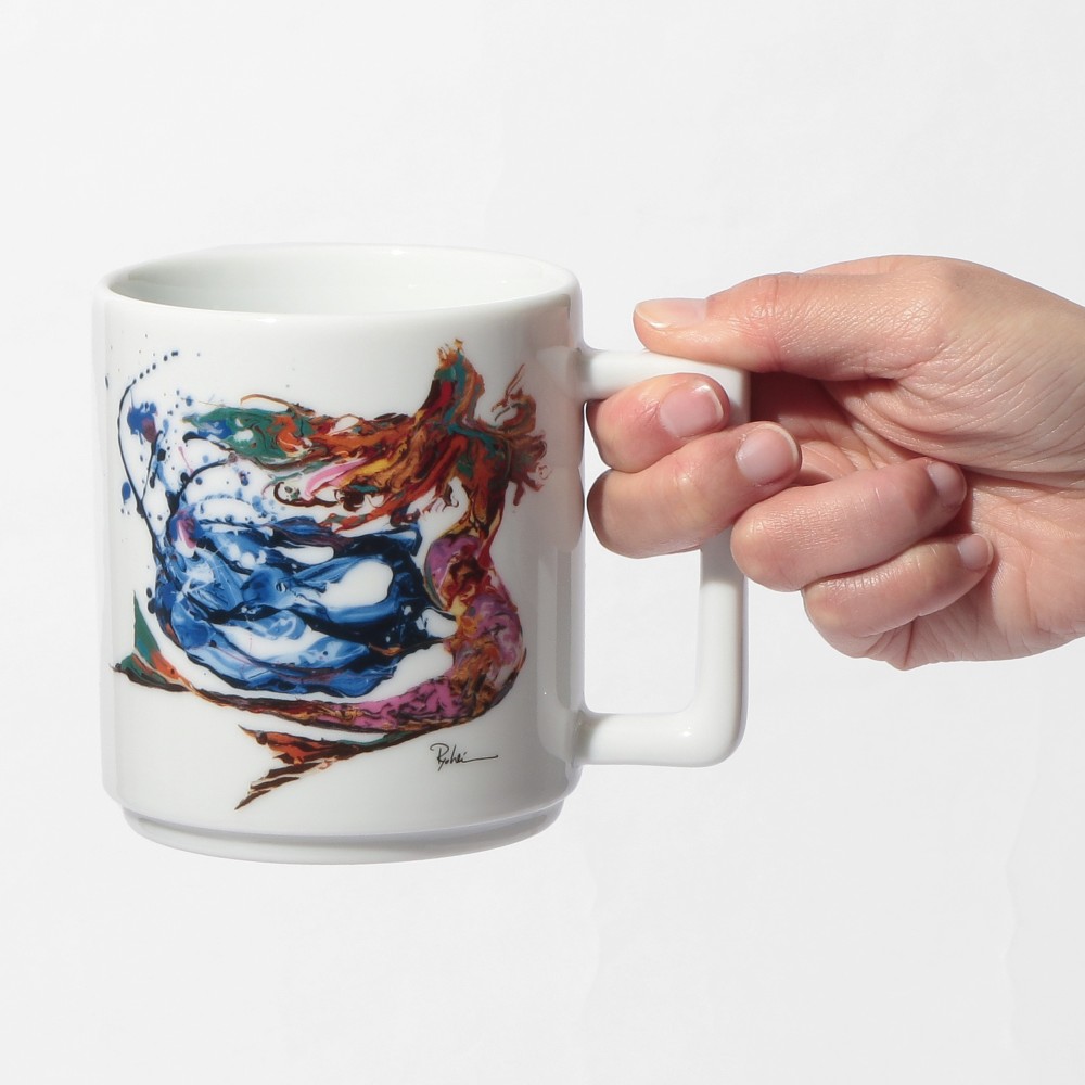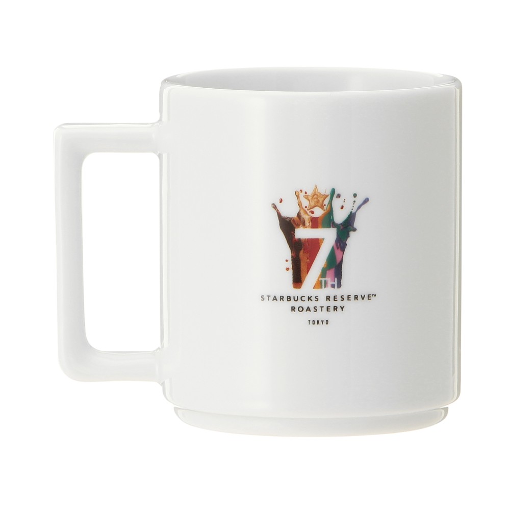 スターバックス リザーブ® ロースタリー 東京の7周年を記念したマグカップ。キャンバスのような白磁に映える、躍動感あふれるサイレンのアートが印象的です。サイレンの頭上で輝くクラウンをイメージした7周年アイコン付き。
