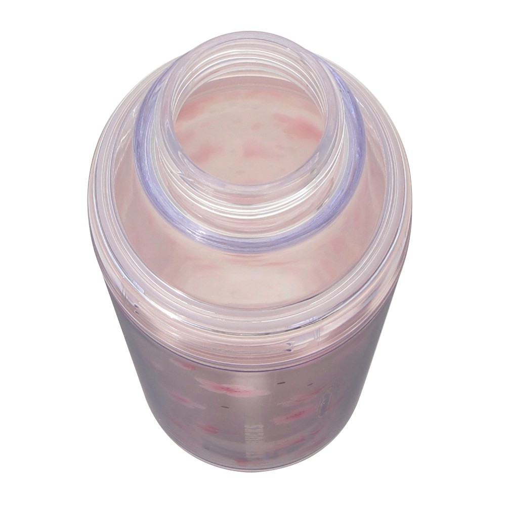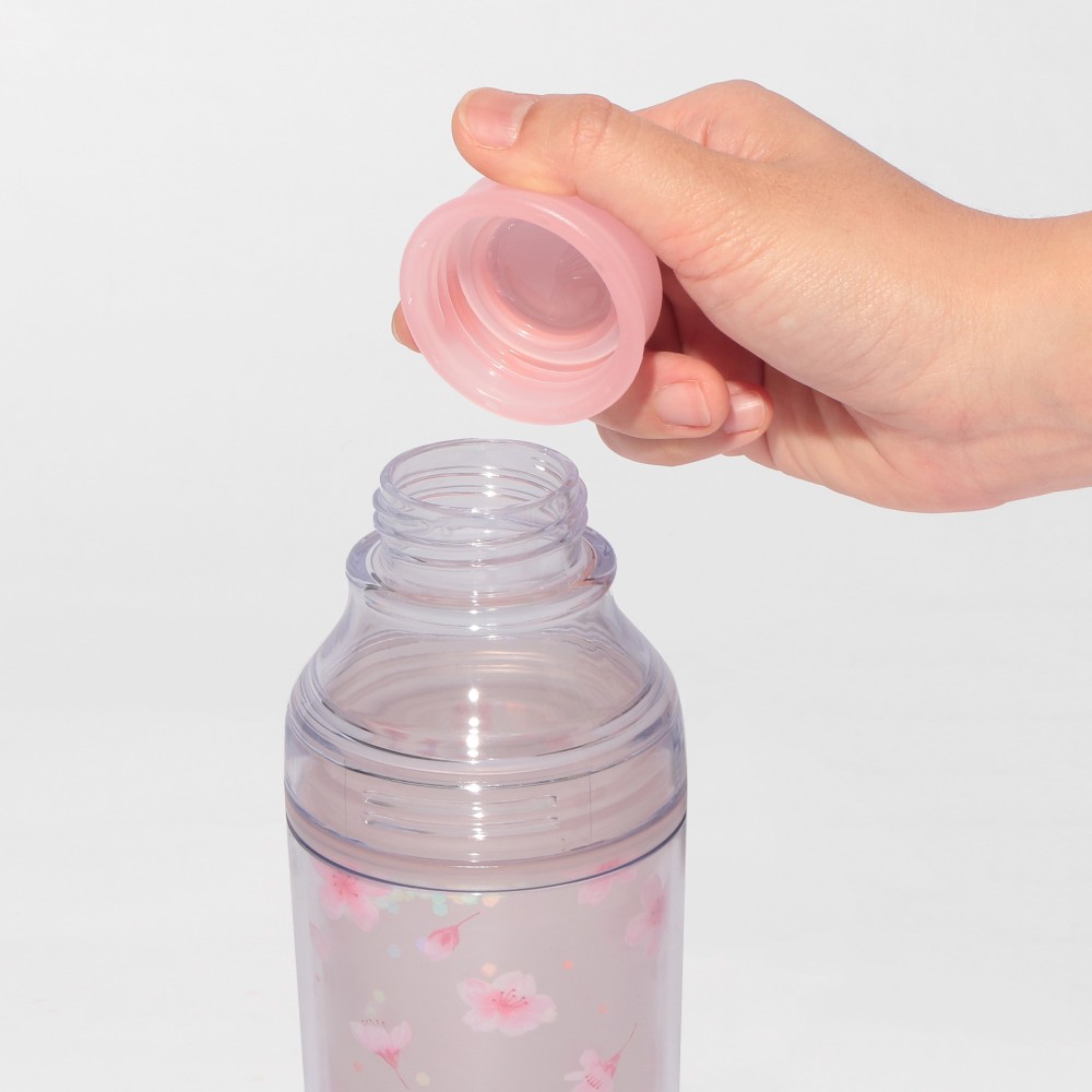 フタは一番上の部分と真ん中の部分の二か所にあるので、シーンに合わせてご使用できます。本体には細かなホログラムの加工がされており、繊細で可憐なイメージが桜の季節にぴったりのデザインです。ボディの下部分が2重構造になっているため、冷たい飲み物を入れても水滴が付きにくく、快適にご使用いただけます。(漏れ防止:あり)