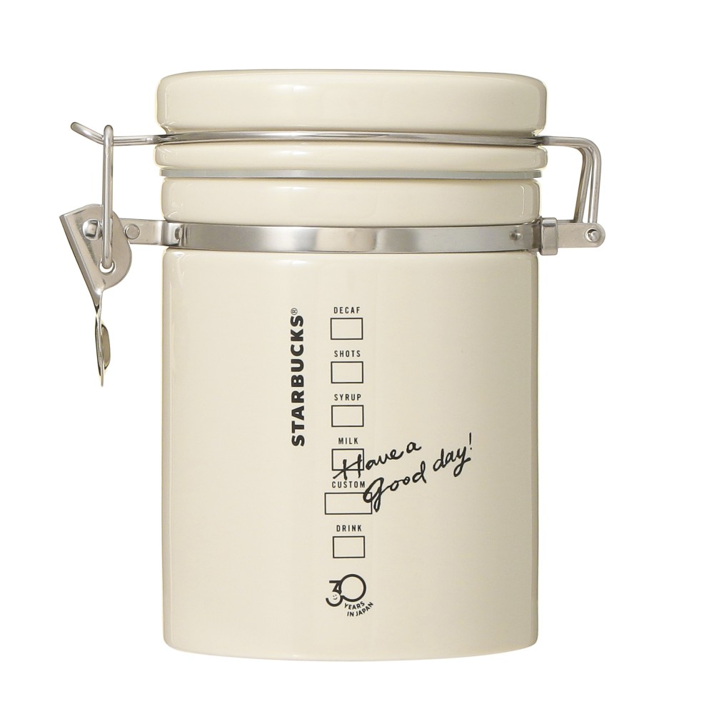 正面には特別なロゴ、背面にはIDボックスと手書き風メッセージ「Have a good day!」の文字と30周年マークでデザインされています。スターバックスらしいナチュラルなアイボリーでシンプルな印象に仕上げました。スターバックスのコーヒー豆が約120~130g程度入るサイズです。