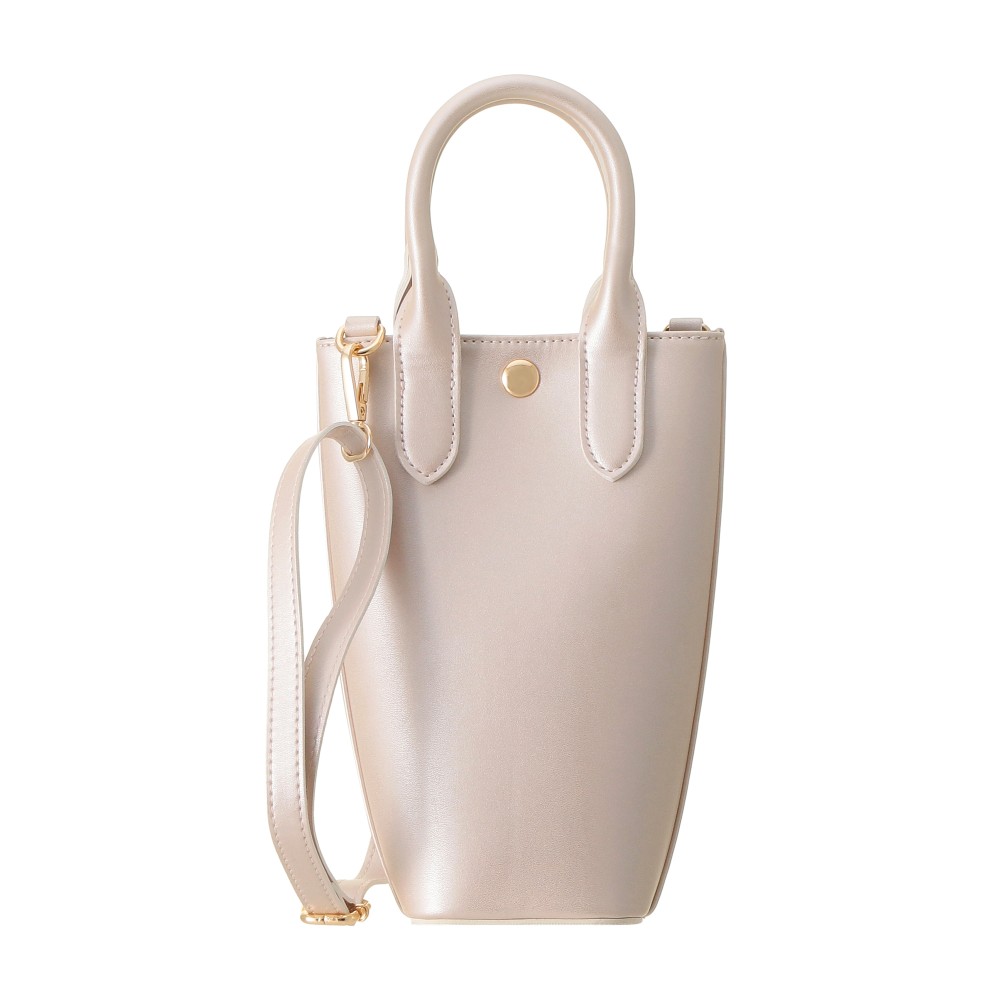 取り外し可能なショルダーストラップが付いた、カップ形状のボトルショルダーバッグです。桜を思わせる淡いメタリックピンクです。表面にはサイレンロゴをエンボスで表現しました。スマートフォンなどが入るサイズの内ポケット付きで、ボトル以外のものを持ち運ぶ際にも便利です。ゴールドの金具が高級感ある仕様です。