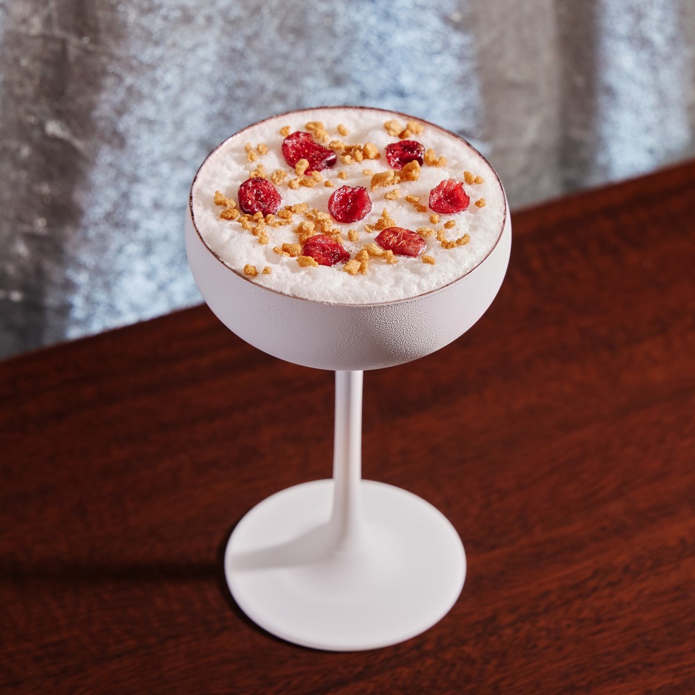 スターバックス ホリデー風物詩のケーキ、クランベリーブリスバーをモチーフにしたブランデーベースのフローズンカクテル。クリームチーズ、クランベリージュース、スパイスをベースに、シナモンクッキーとドライクランベリーをトッピング。
