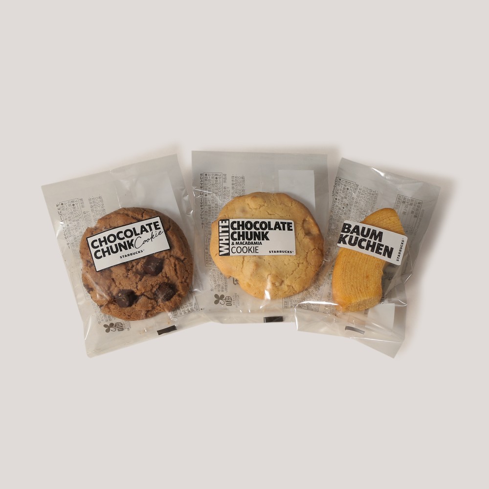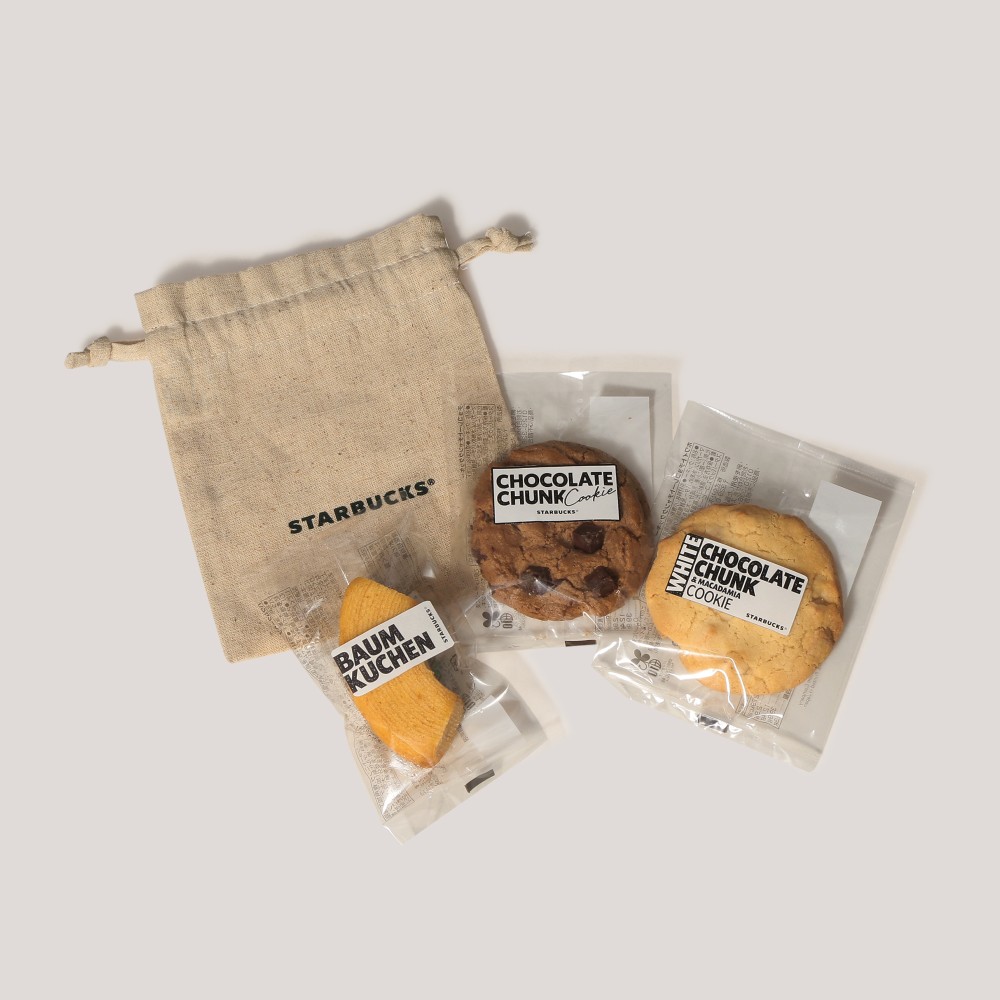 スターバックスで定番のフード3種類を詰め合わせたアソートセットです。専用巾着袋に入れてのお届けとなります。ご自宅用はもちろん、お返しなどのカジュアルなギフトシーンにもおすすめです。内容・チョコレートチャンククッキー 1枚・ホワイトチョコレートチャンク&マカダミアクッキー 1枚・バウムクーヘン 1個