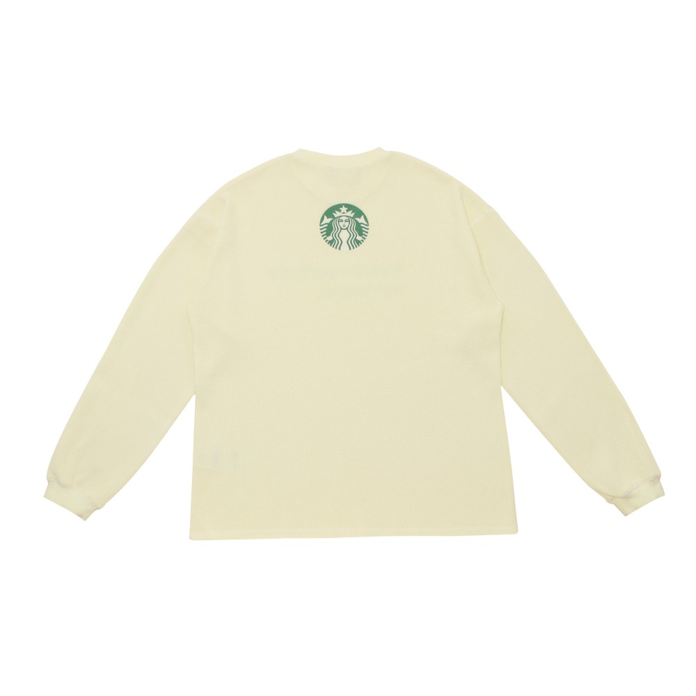 デザイン面では、フロントと背面にプリントアートワーク を配置し、前後どちらから見ても存在感のある仕上がりに。前面には「thisisneverthat」のロゴタイプにstarbucksを組み合わせたオリジナルデザインを採用。背面にはサイレンロゴが配されています。