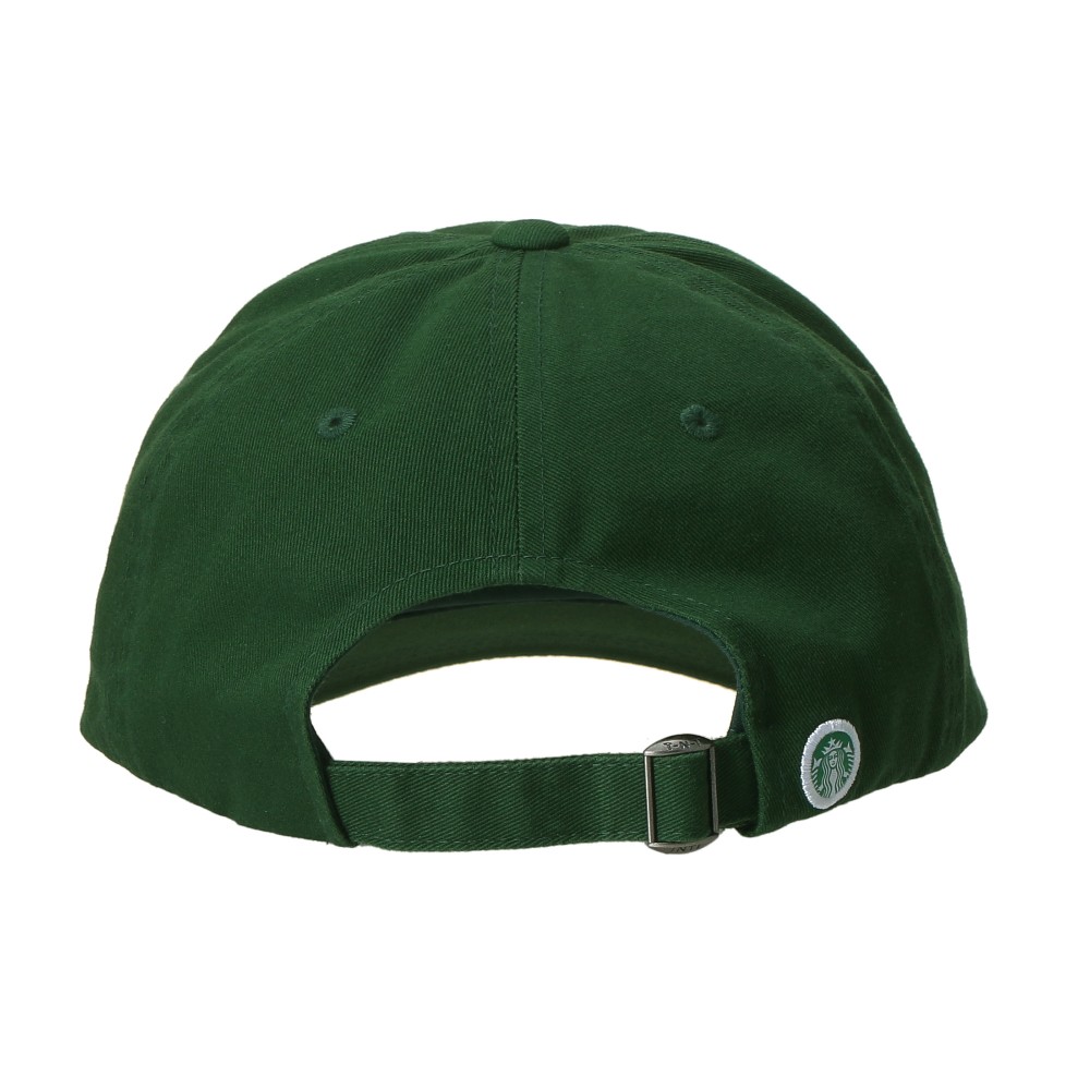 グリーンの前面には、両ブランド名がスクリプト体のタイポグラフィでデザインされています。背面のストラップバック仕様により、お好みのフィット感にスムーズなサイズ調節が可能です。