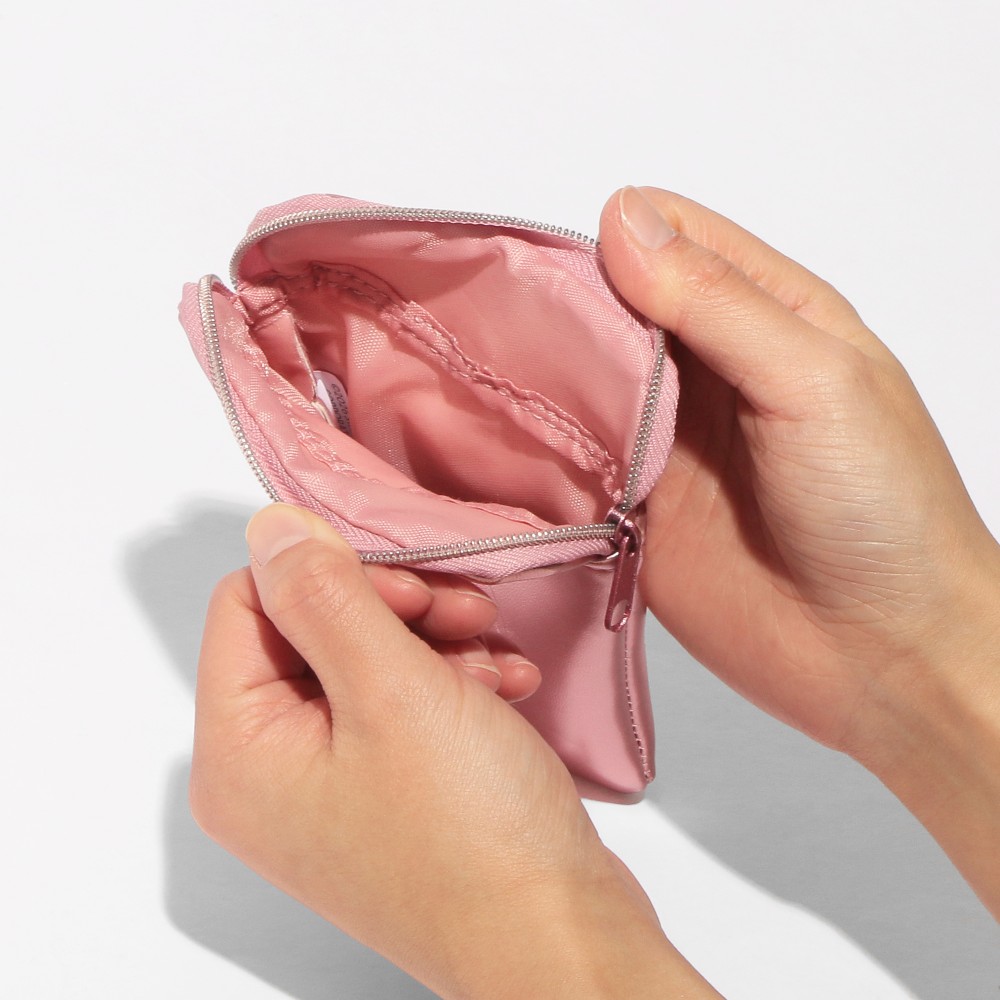 ドリンクチケットとカップ型のポーチです。ポーチにはカラビナが付いているので、バッグなどに付けて持ち歩くことができます。ポーチはリップやカードなどを入れるのにちょうどよいサイズなので、シーンによってお好きなものを入れていただけます。今回はグリッターのラメがきらきらとした、明るいピンク色のデザインです。日々のちょっとした気持ちをカジュアルに伝えてみませんか。