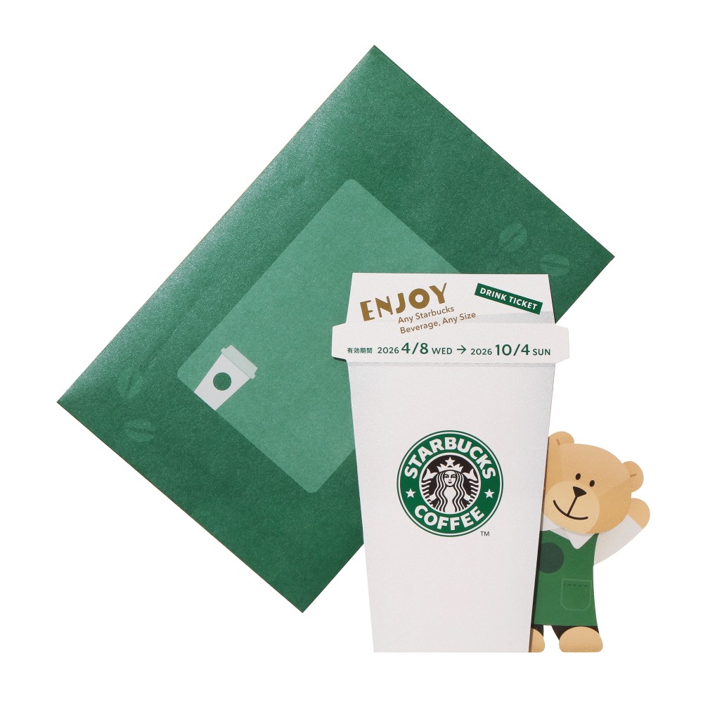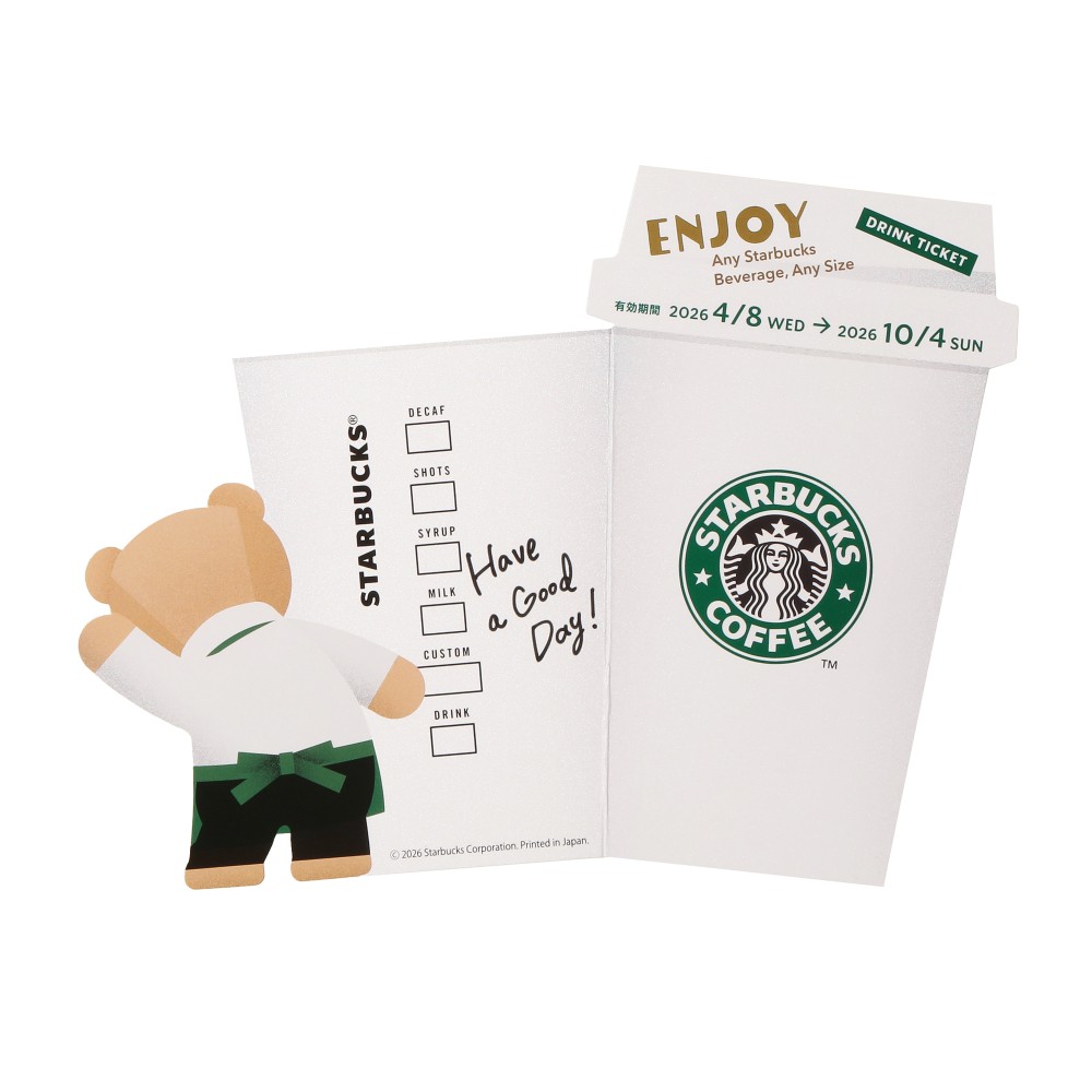 メッセージにドリンクを添えて贈るというコンセプトのドリンク引換券付きメッセージカードです。ベアリスタとカップのデザインは、贈る人やシーンを選ばずに、どんなギフトにもぴったりです。正面にはスターバックスが日本に誕生した当時のロゴデザイン、、背面にはIDボックスと手書き風メッセージ「Have a good day!」の文字がデザインされています。