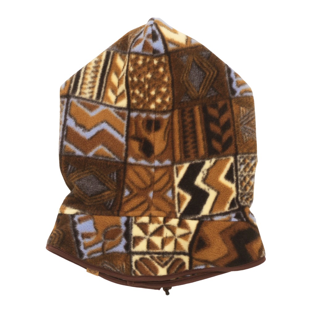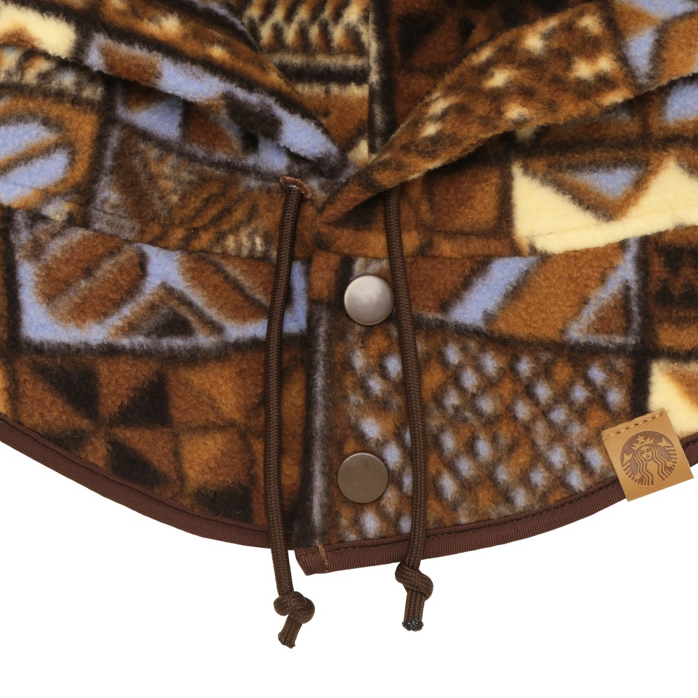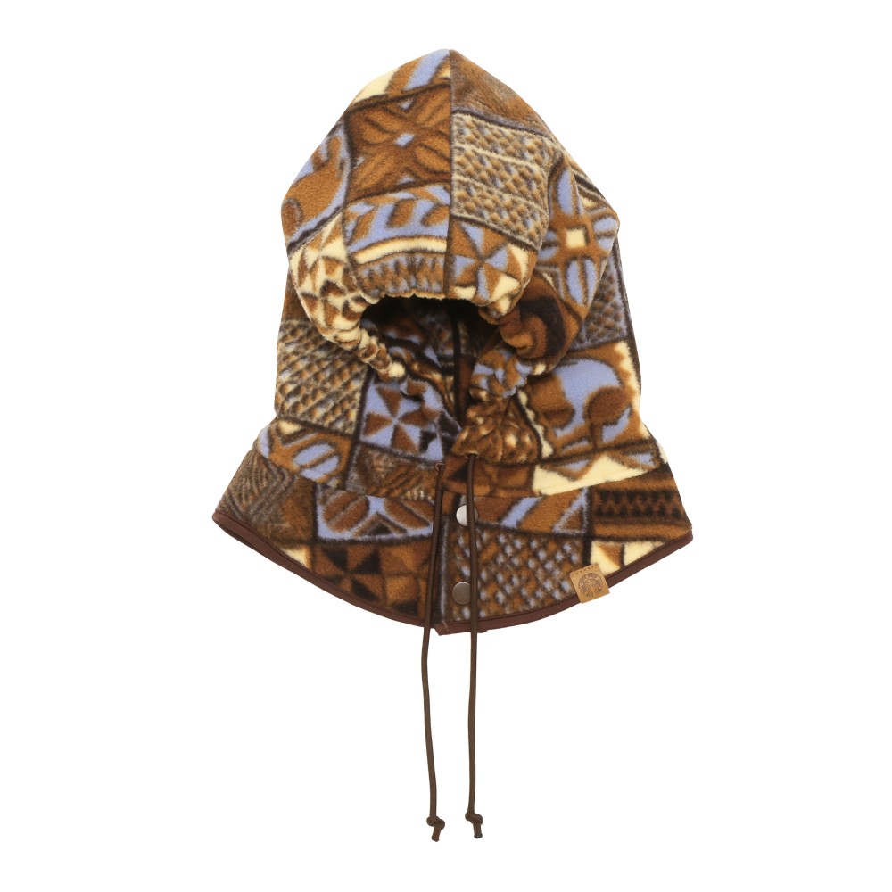 このフリースバラクラバでは、オリジナルの総柄を制作し、素材の膨らみが消えないようインクジェットプリントで表現をしています。素材は、程よい肉感のポリエステルフリースを使用。紐付きでフィット感を調整でき、スタイルに合わせてアレンジが可能です。二枚生地仕立てにより保温性が高く、首元から頭までしっかりカバーできます。