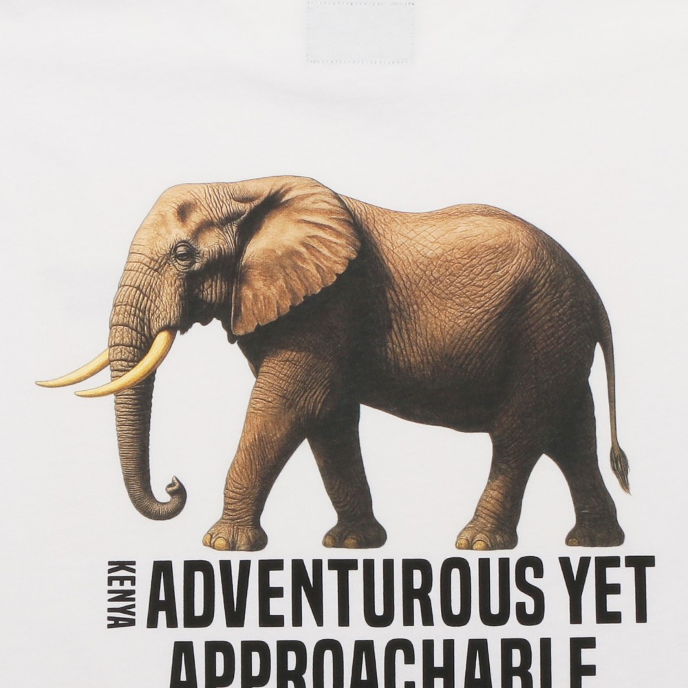 このグラフィック半袖Teeには、現地に生息するゾウを背中に大きくプリントしています。シルエットは、肩幅と身幅にゆとりを持たせ、ネックはできるだけ身体に沿わせる設定にしメリハリのあるシルエットに調整しました。素材は、14番手の糸で織られたUSAコットン天竺を採用。空紡糸の為シャリみのあるドライタッチと季節を問わない程よい肉感が特徴です。裾にはオリジナルのピスネームでアクセントを入れています。