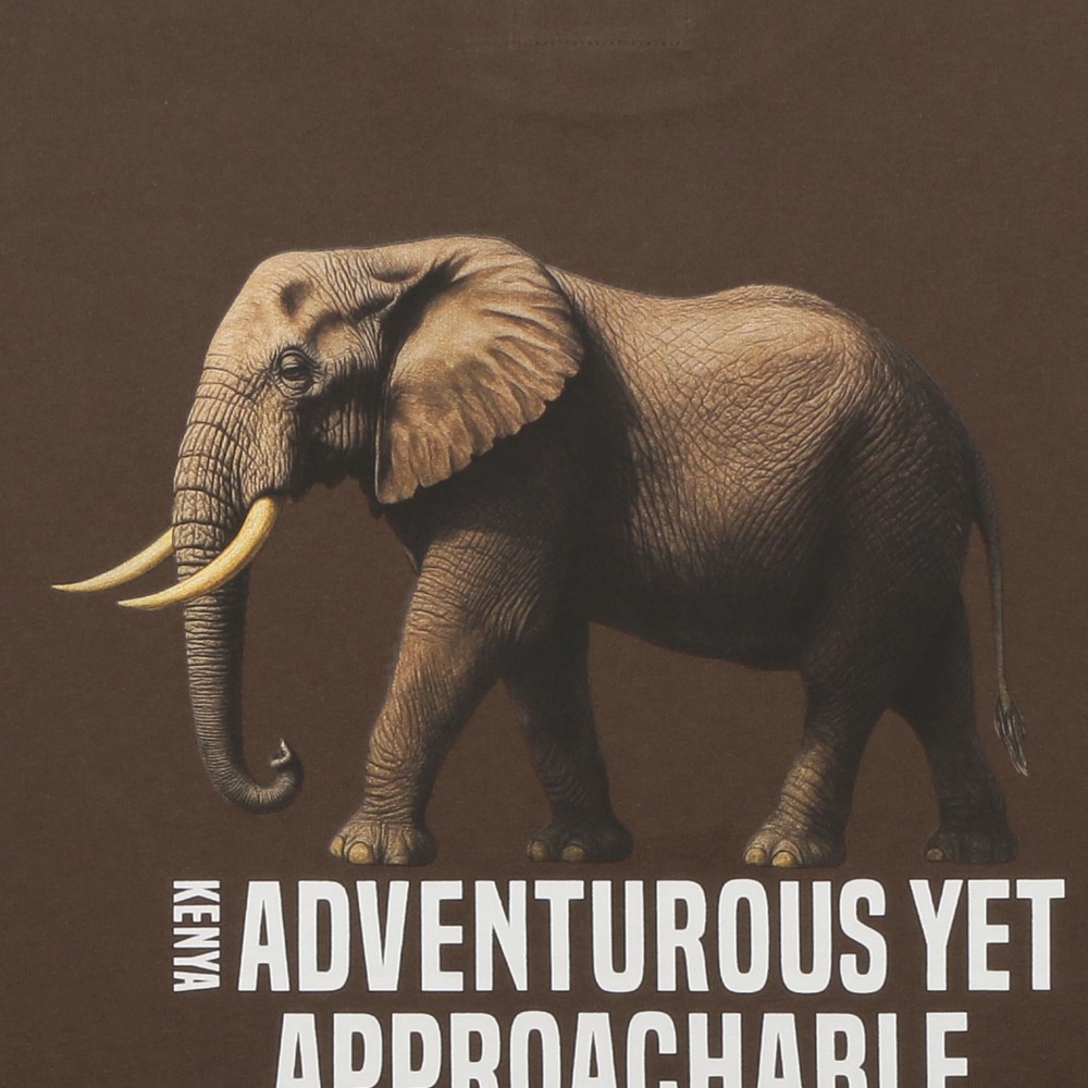 このグラフィック半袖Teeには、現地に生息するゾウを背中に大きくプリントしています。シルエットは、肩幅と身幅にゆとりを持たせ、ネックはできるだけ身体に沿わせる設定にしメリハリのあるシルエットに調整しました。素材は、14番手の糸で織られたUSAコットン天竺を採用。空紡糸の為シャリみのあるドライタッチと季節を問わない程よい肉感が特徴です。裾にはオリジナルのピスネームでアクセントを入れています。