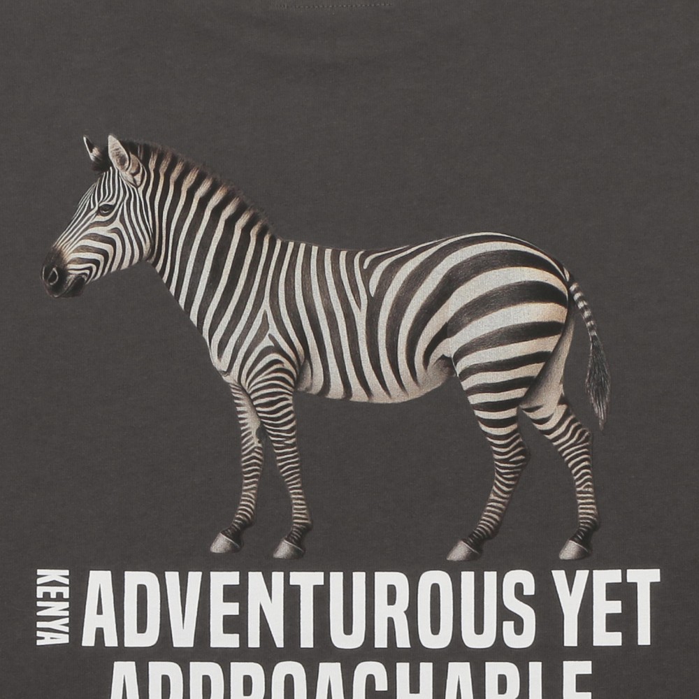 このグラフィック半袖Teeには、現地に生息するシマウマを背中に大きくプリントしています。シルエットは、肩幅と身幅にゆとりを持たせ、ネックはできるだけ身体に沿わせる設定にしメリハリのあるシルエットに調整しました。素材は、14番手の糸で織られたUSAコットン天竺を採用。空紡糸の為シャリみのあるドライタッチと季節を問わない程よい肉感が特徴です。裾にはオリジナルのピスネームでアクセントを入れています。