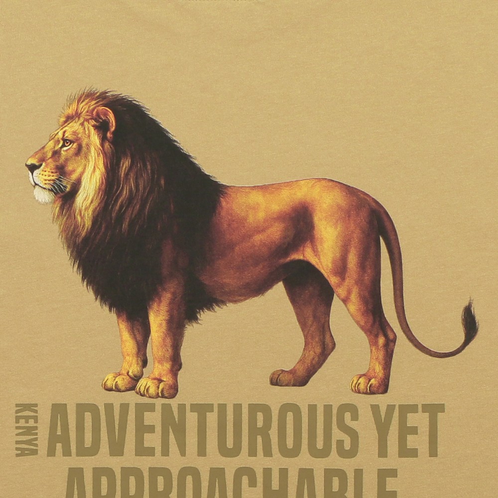 このグラフィック半袖Teeには、現地に生息するライオンを背中に大きくプリントしています。シルエットは、肩幅と身幅にゆとりを持たせ、ネックはできるだけ身体に沿わせる設定にしメリハリのあるシルエットに調整しました。素材は、14番手の糸で織られたUSAコットン天竺を採用。空紡糸の為シャリみのあるドライタッチと季節を問わない程よい肉感が特徴です。裾にはオリジナルのピスネームでアクセントを入れています。