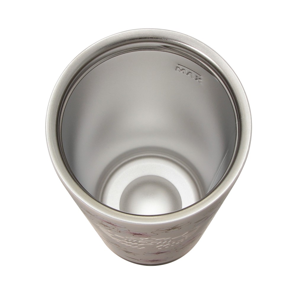 リッドにロック機能がある、スターバックスらしいカップ形状のステンレスボトルです。ボタンを右にスライドさせ、押し込むことでフタが開きます。上品なピンクベージュのボディに、繊細なタッチで描かれた桜が華やかなデザインです。底面のゴールド部分もアクセントになっています。サイレンロゴがエンボスで表現されています。真空二重構造ステンレスで保温・保冷性に優れています。(漏れ防止:あり)