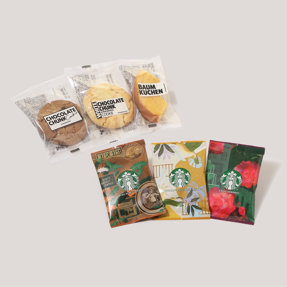スターバックスで定番の3種のフードと3種のコーヒーを詰め合わせたアソートセットです。特別な器具を使うことなく手軽に味わえるドリップタイプのコーヒーとクッキーで、おうちスターバックスをお楽しみください。